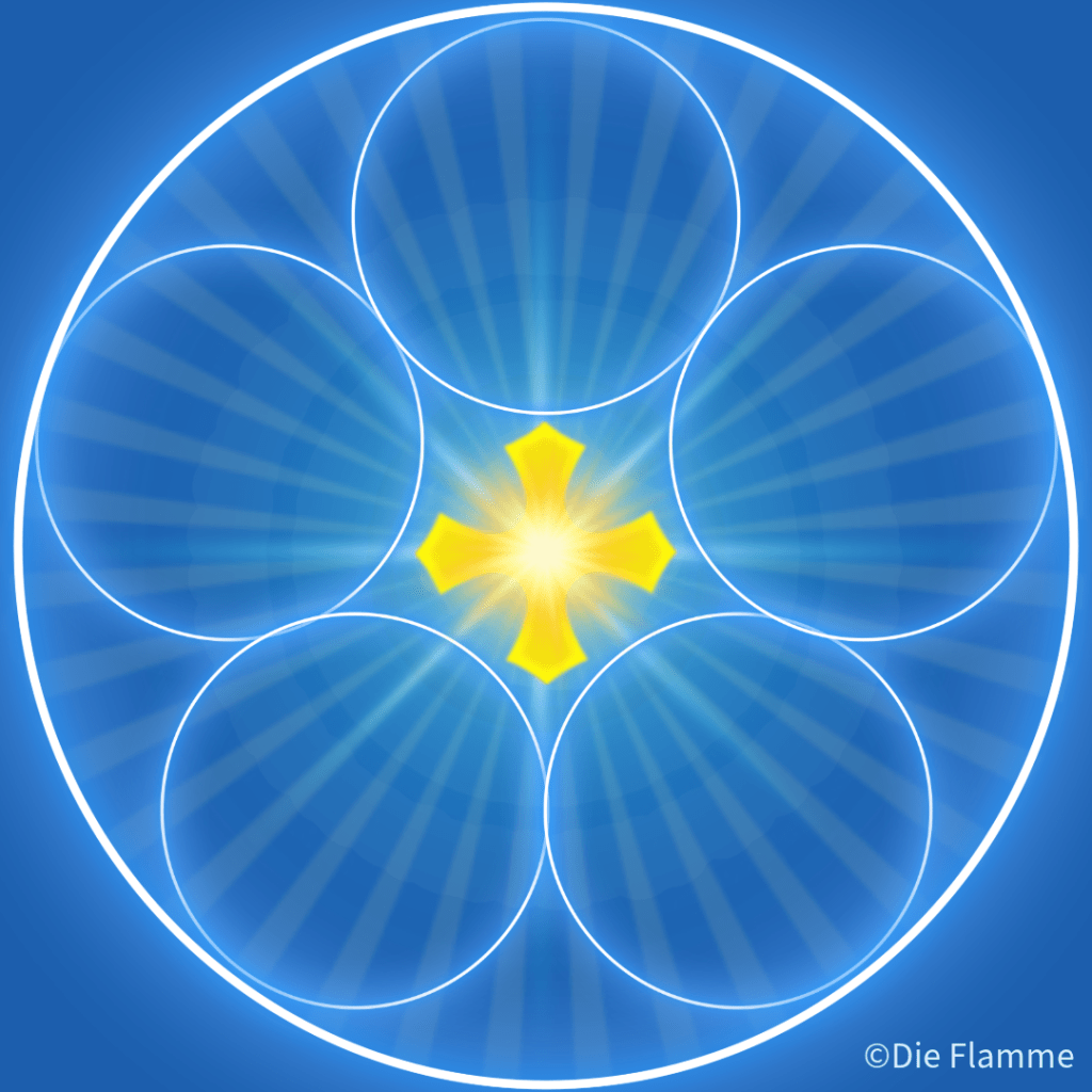 Jeder Kreis stellt eine Eigenart dar, die ihrerseits durch mehrere miteinander verbundene, aber voneinander unabhängige Personen belebt wird. Diese Kreise symbolisieren das harmonische Zusammenwirken der Menschen im Dienste ihres Königs. Die Kreise oder besser gesagt Ringe bilden einen Wall, der dem Kraft spendenden Herz, dem König, Schutz und Verankerung bietet und gleichzeitig die erhaltenen Strahlen weitergibt. Diese Ringe sind in ständiger unaufhörlicher Bewegung, es gibt keinen Stillstand und keine Stockung, was ein Hinweis auf das unbedingte Gesetz der Bewegung ist. Die Reinheit der Diener, die durch den Blumenkranz des einzelnen geschmückten Hauptes symbolisiert wird, bilden die Bedingung der Verankerung Abdruschin-Parzival-Imanuels in ihrer Mitte, da Liebe sich nicht senken kann, wo keine Reinheit herrscht, wie es aus der Gralsbotschaft bekannt ist. Das geistige Bild, wie es oben illustriert zu sehen ist, ist blau. Blau gilt volkstümlich als die Farbe der Treue, die, wenn sie richtig gelebt wird, von der gottgewollten Liebe durchdrungen ist (siehe dazu Vortrag “Pflicht und Treue”). Jeder dieser Diener ist in einem blauen Gewand zu sehen, die blauen leuchtenden Kreise auf einem tiefblauen eisigen Boden schneiden. Keine unterschiedlichen Farben der einzelnen Elfen sind zu sehen, denn die Betonung liegt auf der Einheit, nicht des Einzelnen Aufgabe und Wirken, sondern auf dem gemeinsamen Ineinandergreifen, wie die Glieder, die zusammen eine Kette bilden. Die gleiche Farbe der Kleider deutet auch auf die Gleichwertigkeit untereinander hin. Die Ausstrahlung dieses gemeinsamen Wirkens in der Liebe ist blau, die Farbe, die Liebe und Reinheit im Göttlichen vereint (Irmingard und Maria vereint in Elisabeth der Urkönigin).